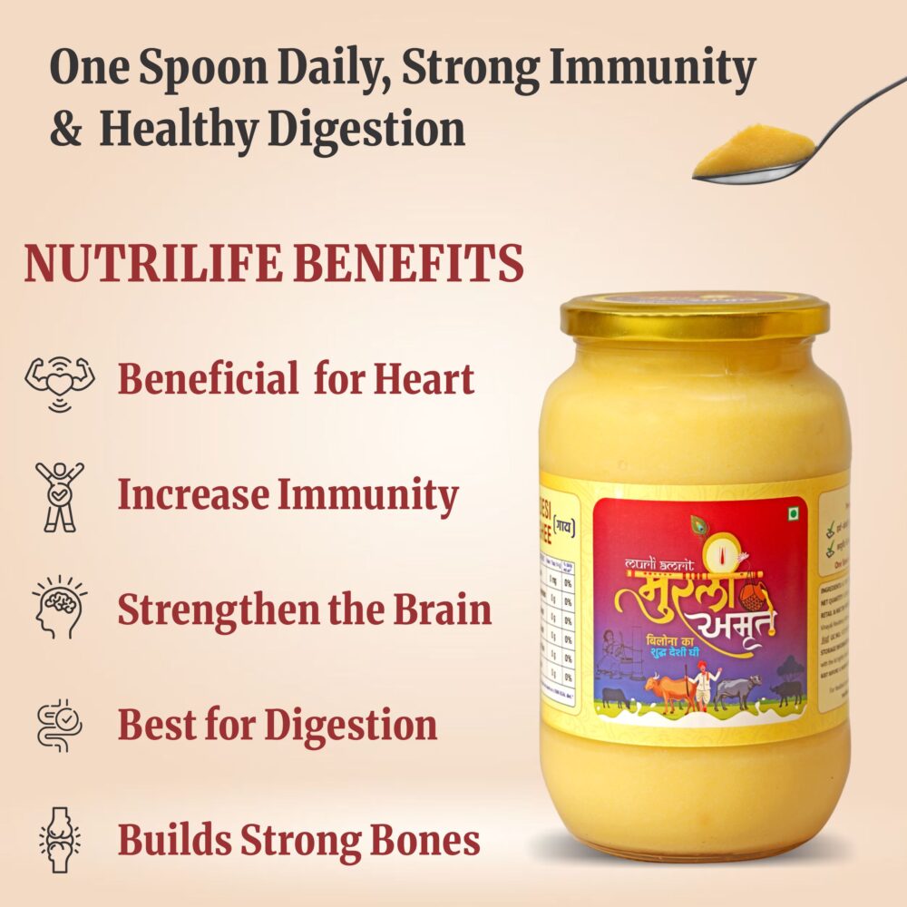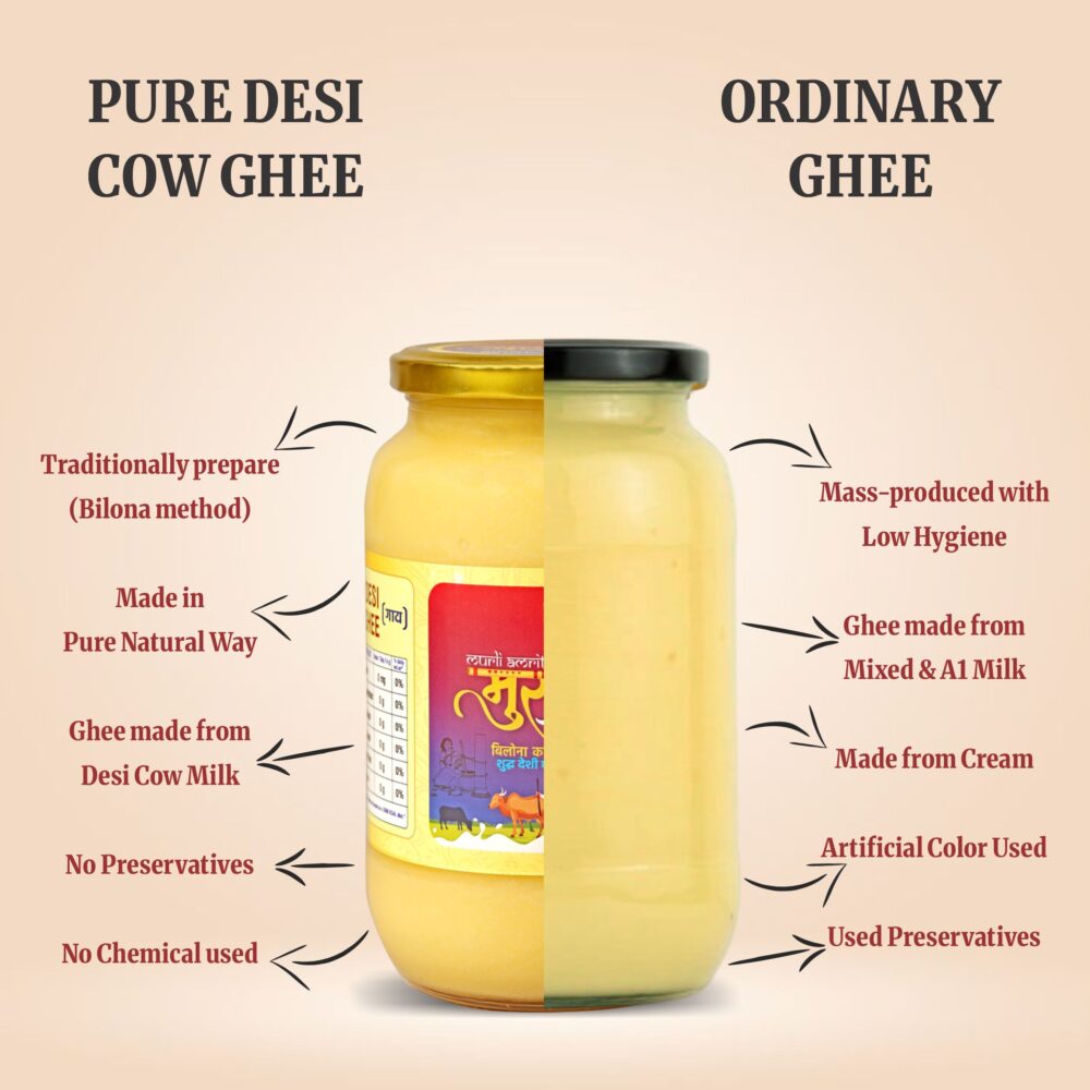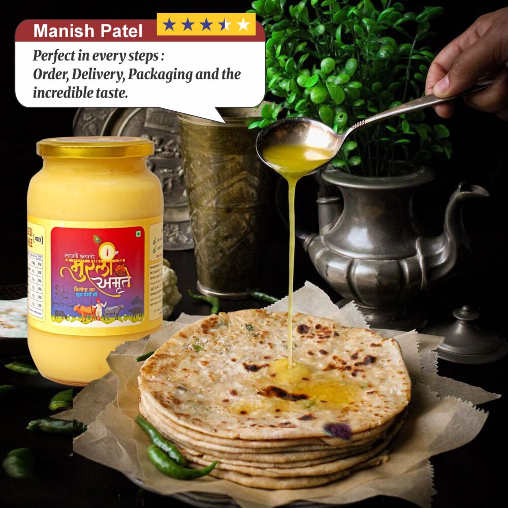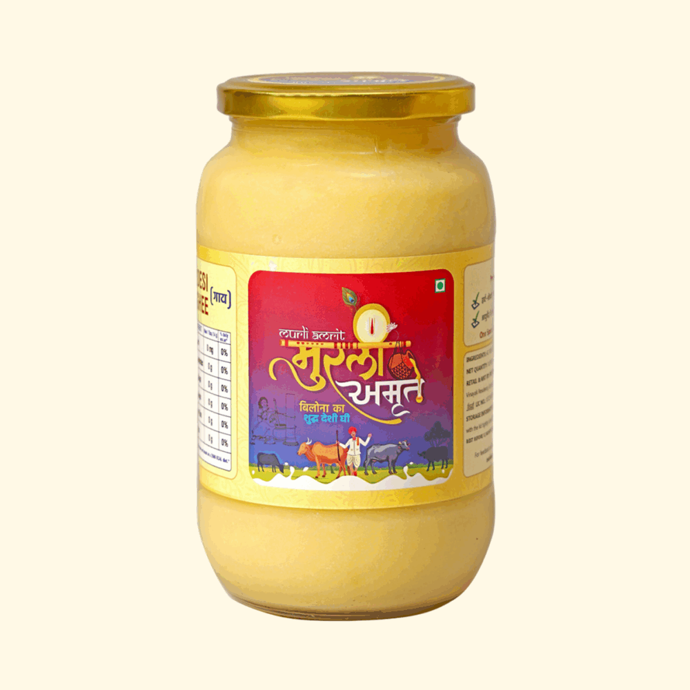 Murli Amrit Desi Cow Ghee is priced higher than normal ghee because it is made using traditional methods and pure raw materials that take more time, effort and care. Unlike mass-produced ghee, Murli Amrit focuses on quality, purity and nutritional value rather than bulk production.