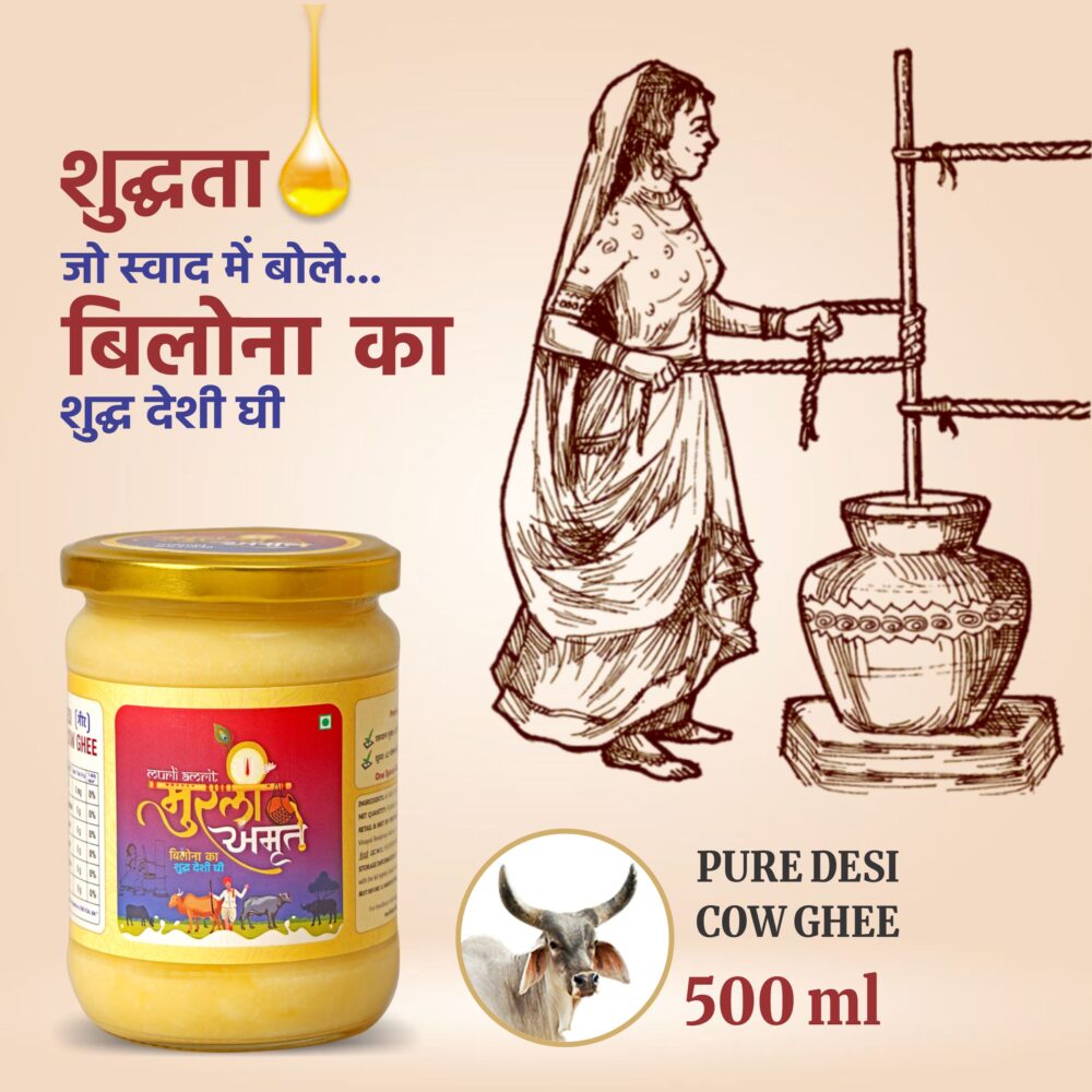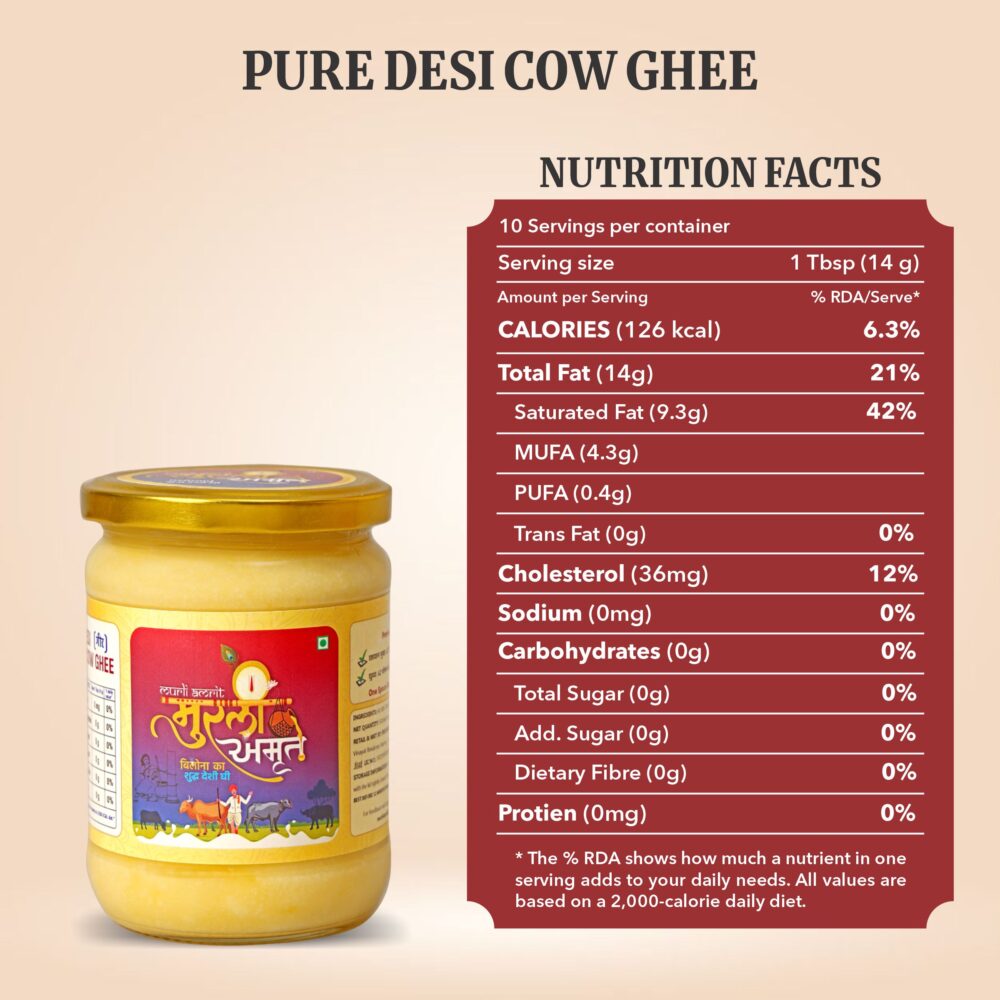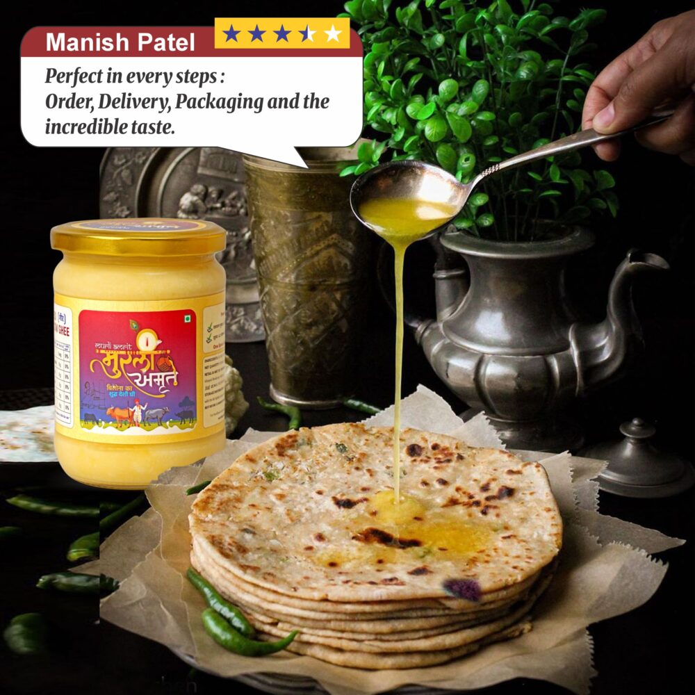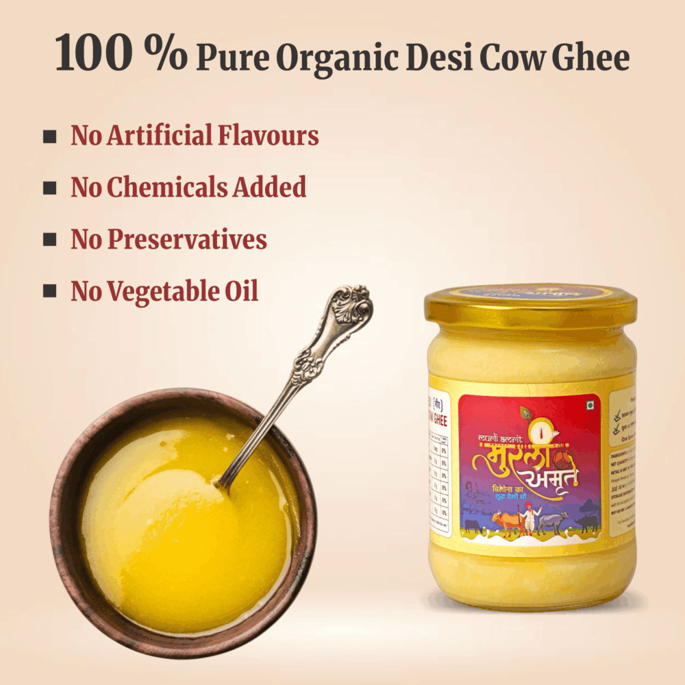 Murli Amrit Desi Cow Ghee is priced higher than normal ghee because it is made using traditional methods and pure raw materials that take more time, effort and care. Unlike mass-produced ghee, Murli Amrit focuses on quality, purity and nutritional value rather than bulk production.