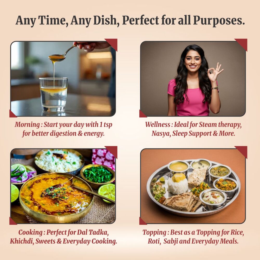 The consistency of ghee naturally changes with weather and temperature, so it can be soft, grainy, semi-solid, or fully liquid — and all of these are completely normal.