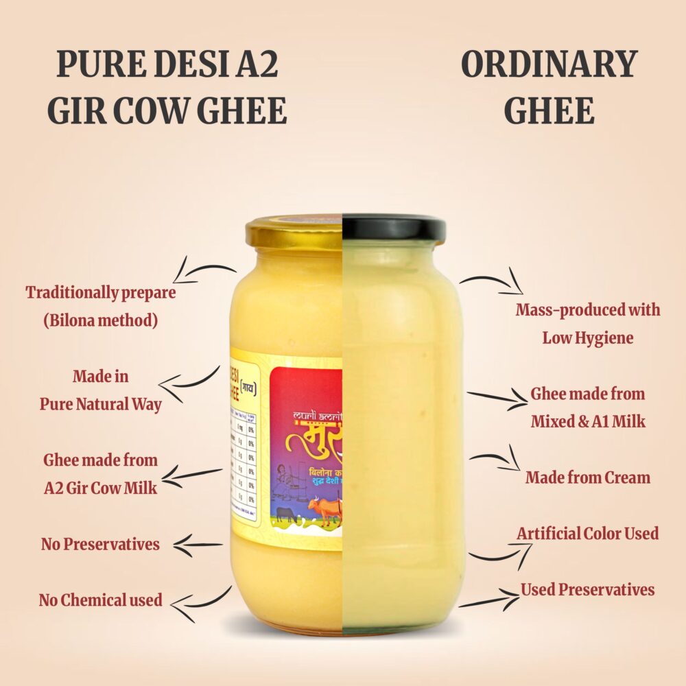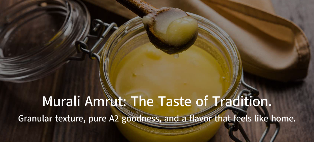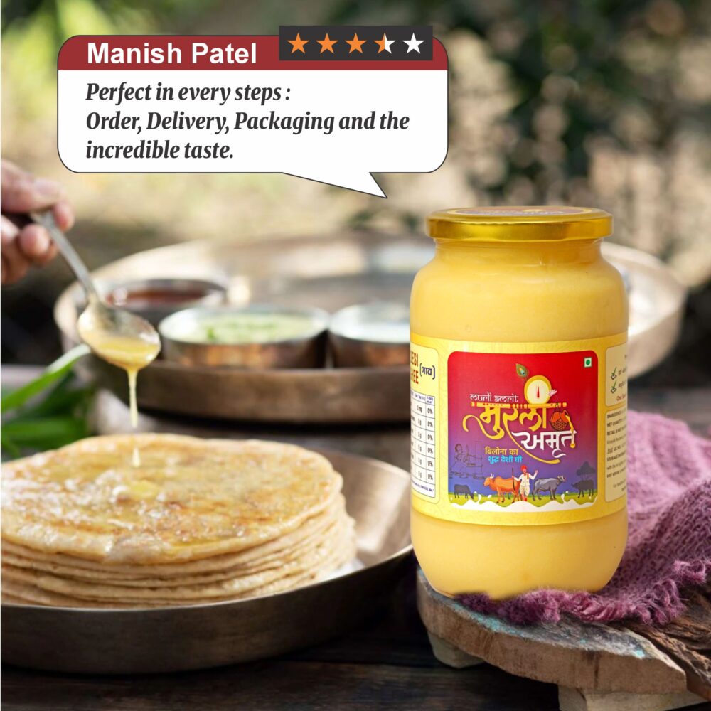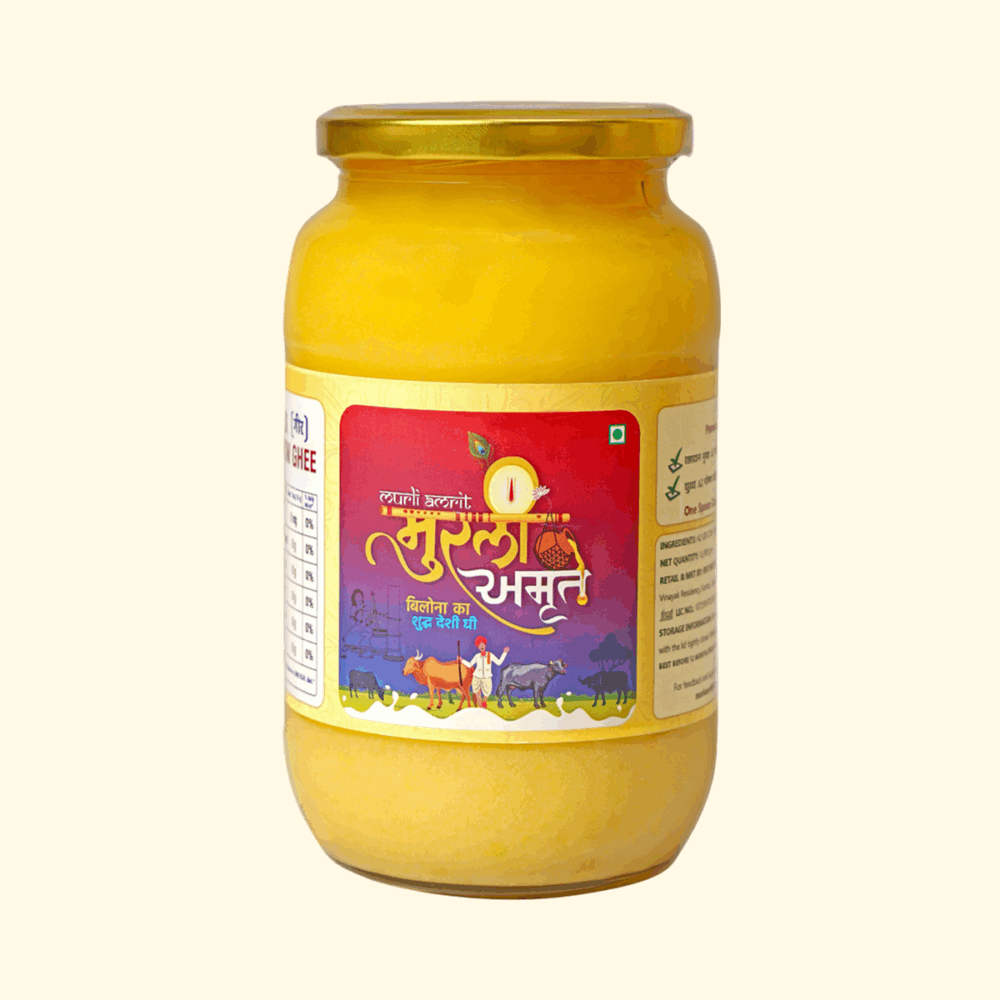 Murli Amrit Desi Cow Ghee is priced higher than normal ghee because it is made using traditional methods and pure raw materials that take more time, effort and care. Unlike mass-produced ghee, Murli Amrit focuses on quality, purity and nutritional value rather than bulk production.
