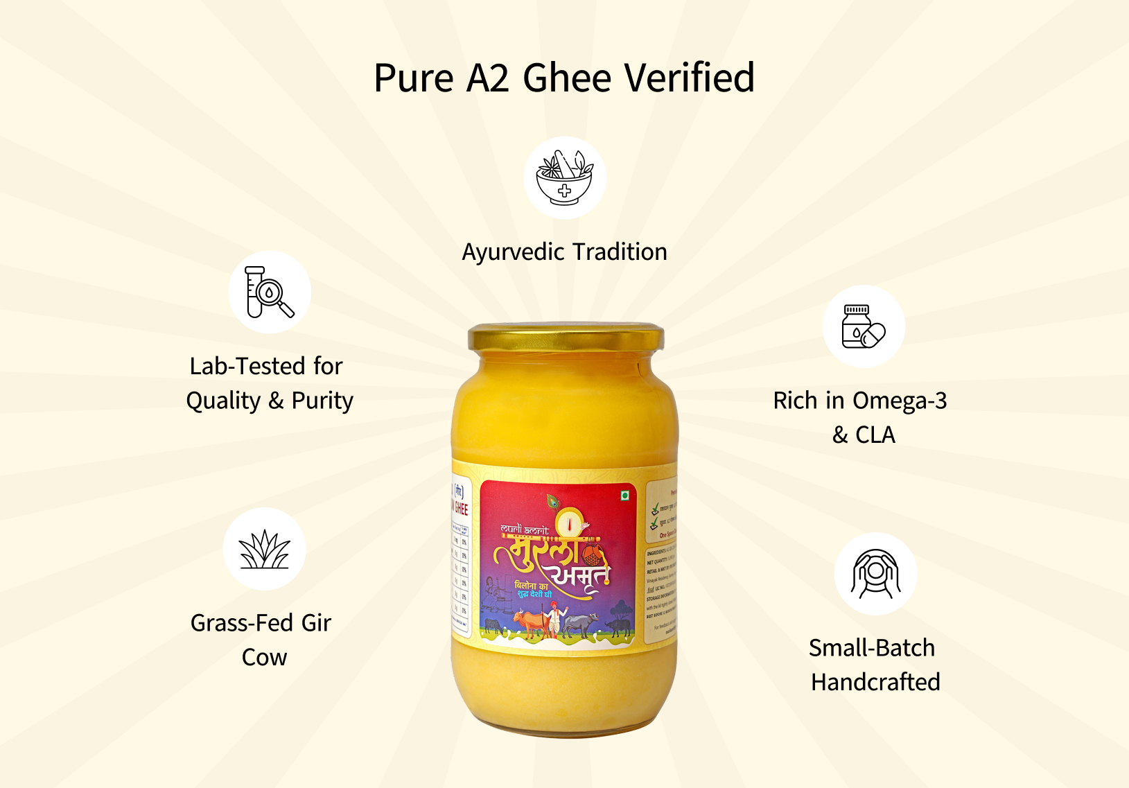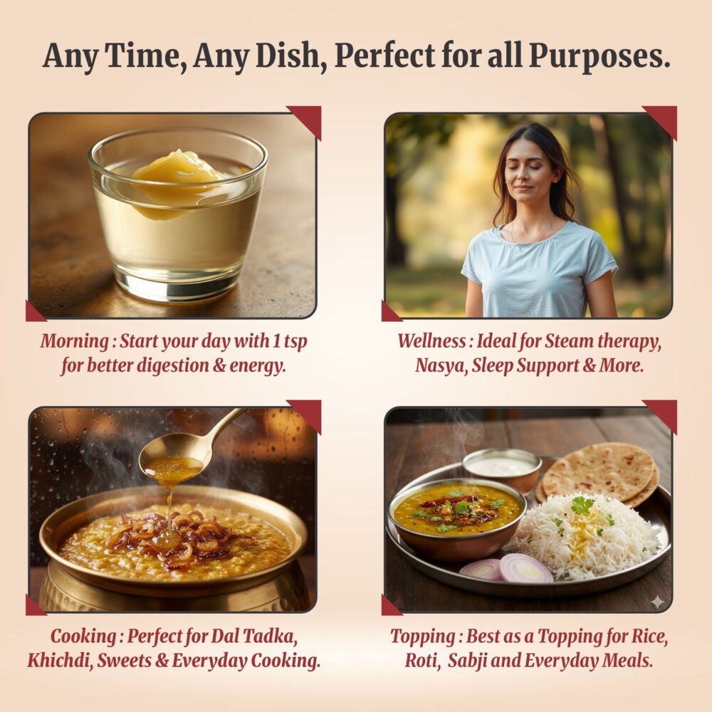 The consistency of ghee naturally changes with weather and temperature, so it can be soft, grainy, semi-solid, or fully liquid — and all of these are completely normal.