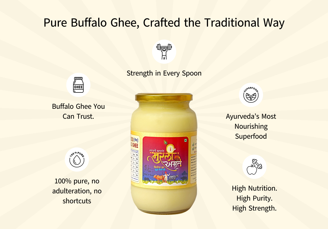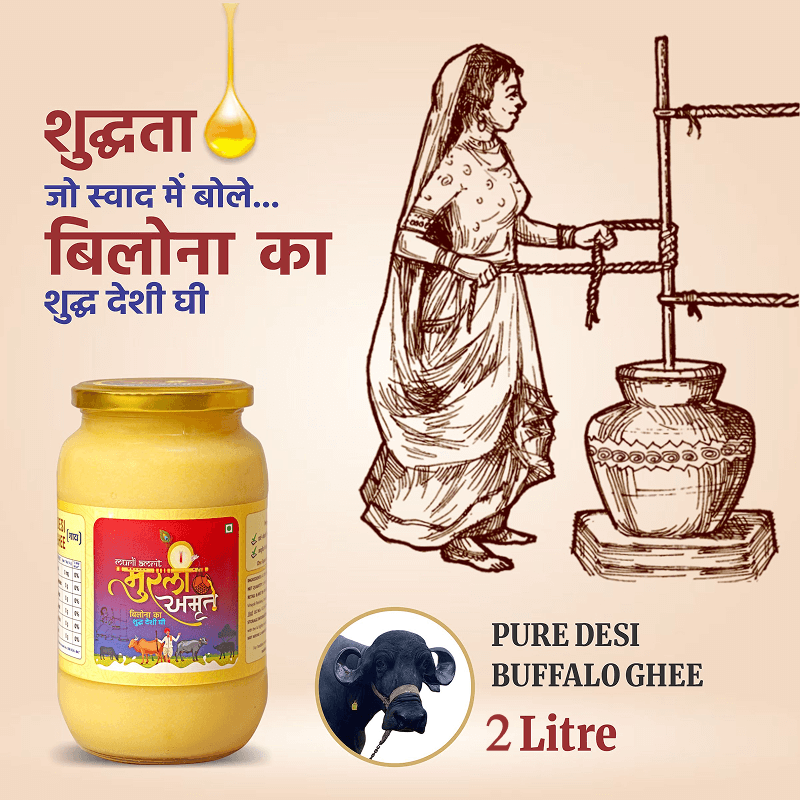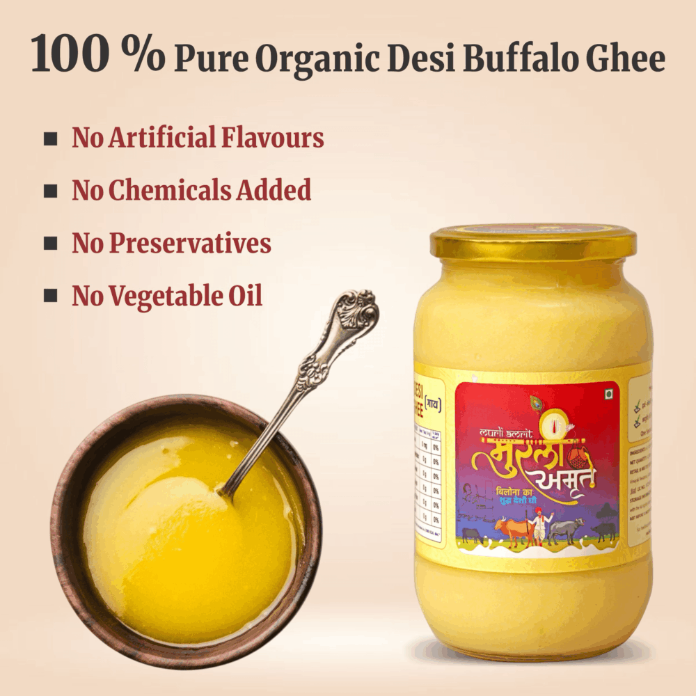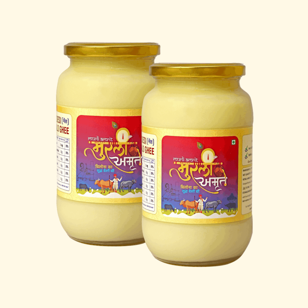 Murli Amrit Desi Cow Ghee is priced higher than normal ghee because it is made using traditional methods and pure raw materials that take more time, effort and care. Unlike mass-produced ghee, Murli Amrit focuses on quality, purity and nutritional value rather than bulk production.