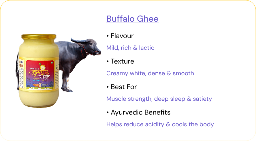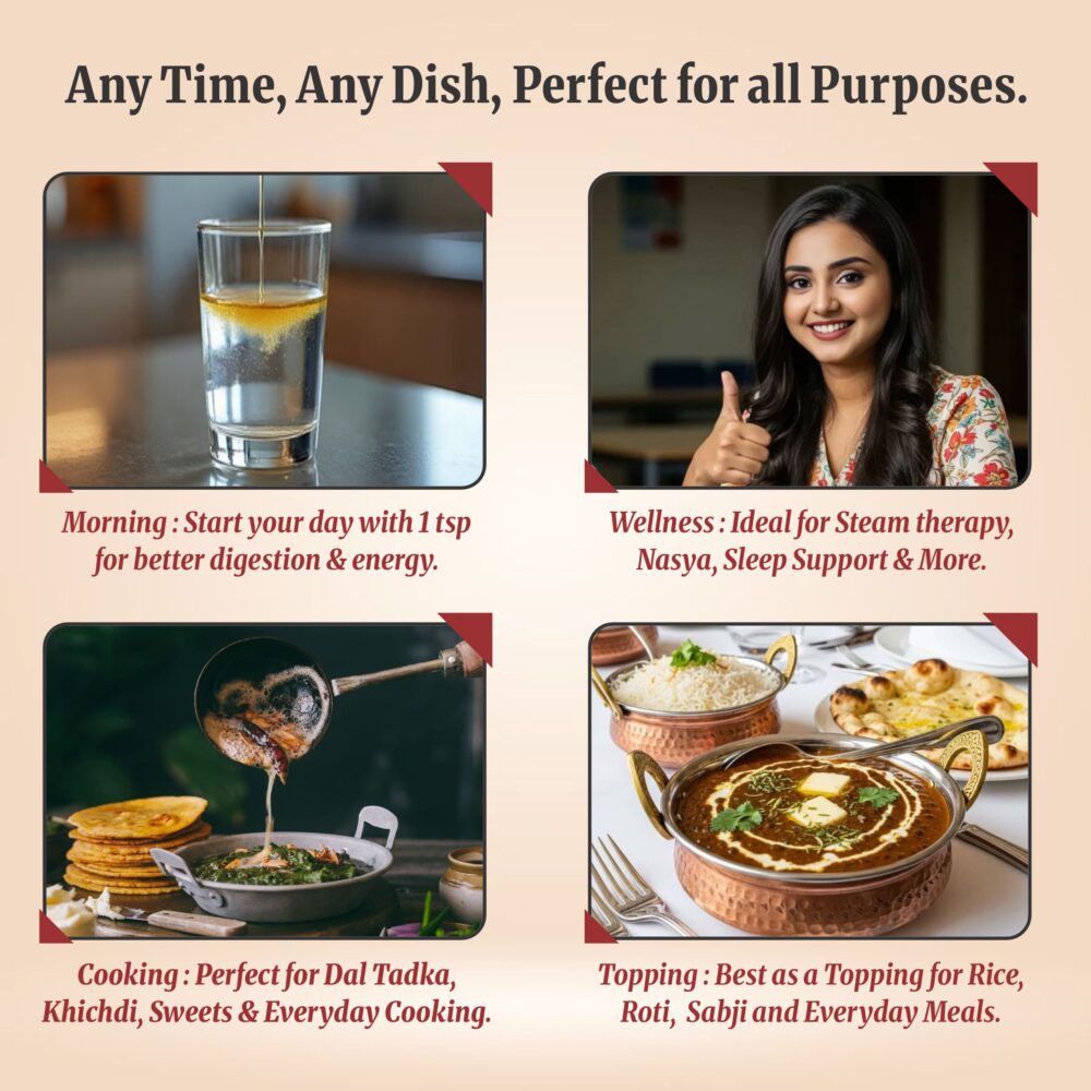 The consistency of ghee naturally changes with weather and temperature, so it can be soft, grainy, semi-solid, or fully liquid — and all of these are completely normal.