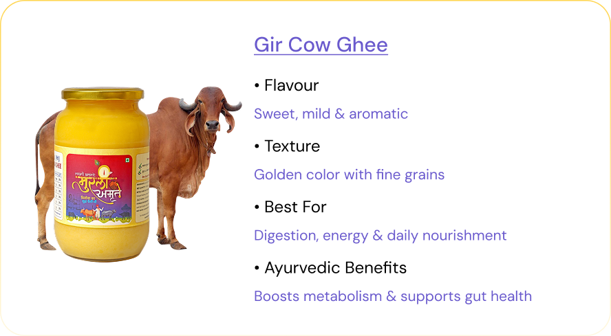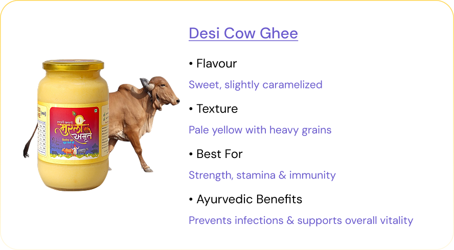 Our ghee has a rich, natural aroma and a smooth, slightly nutty flavor that comes from slow, traditional preparation. It’s made from pure desi cow milk, giving it a deeper, more authentic taste than mass-produced ghee. No added colors or flavors — just pure, clean taste straight from natural cow’s milk.